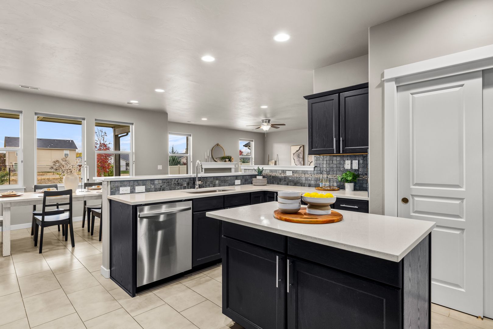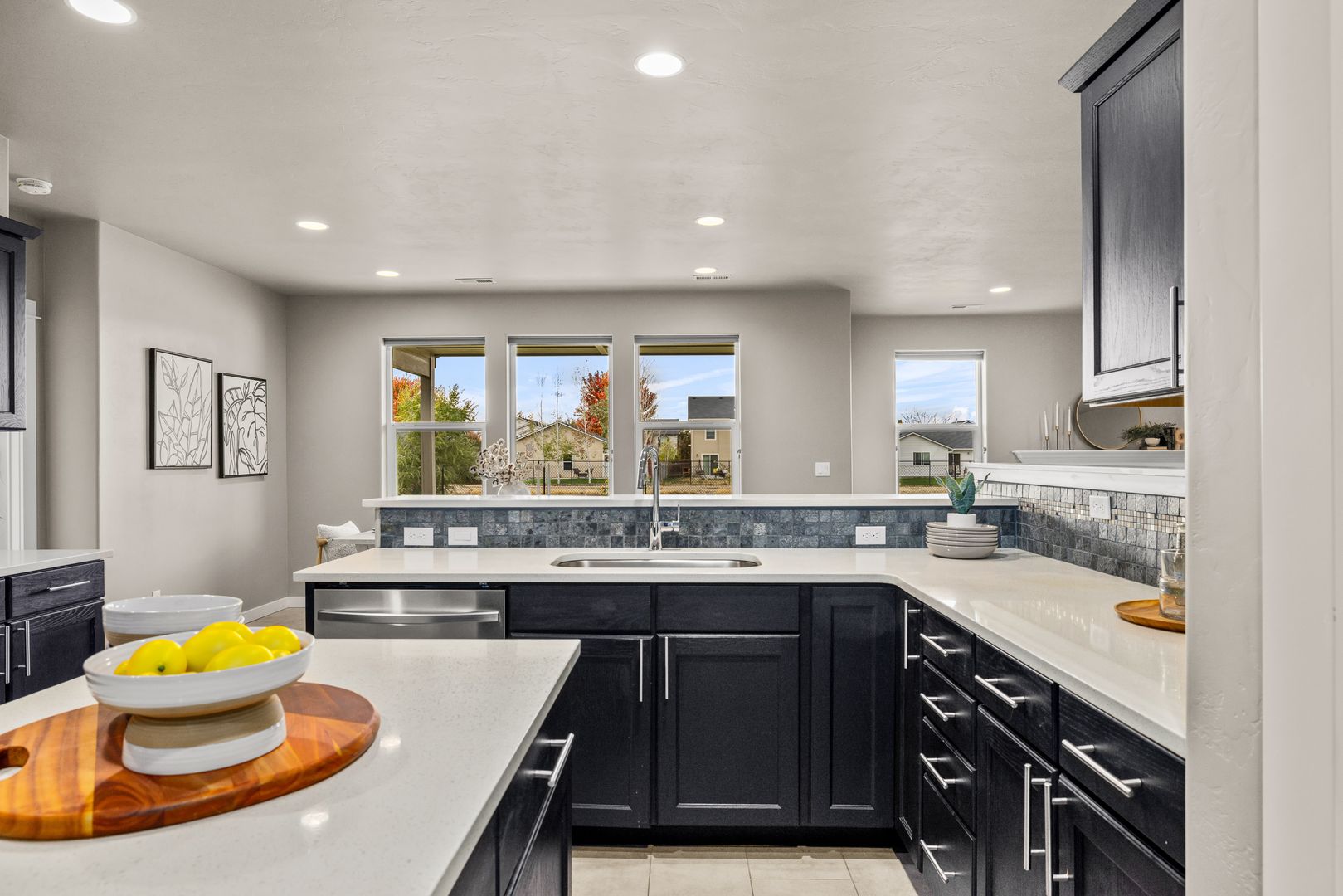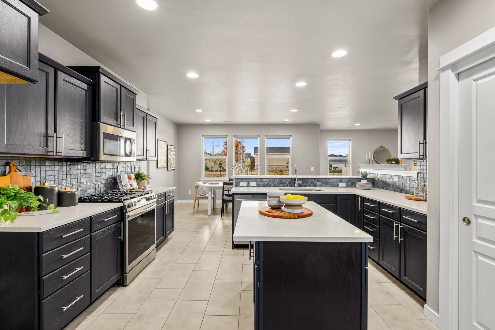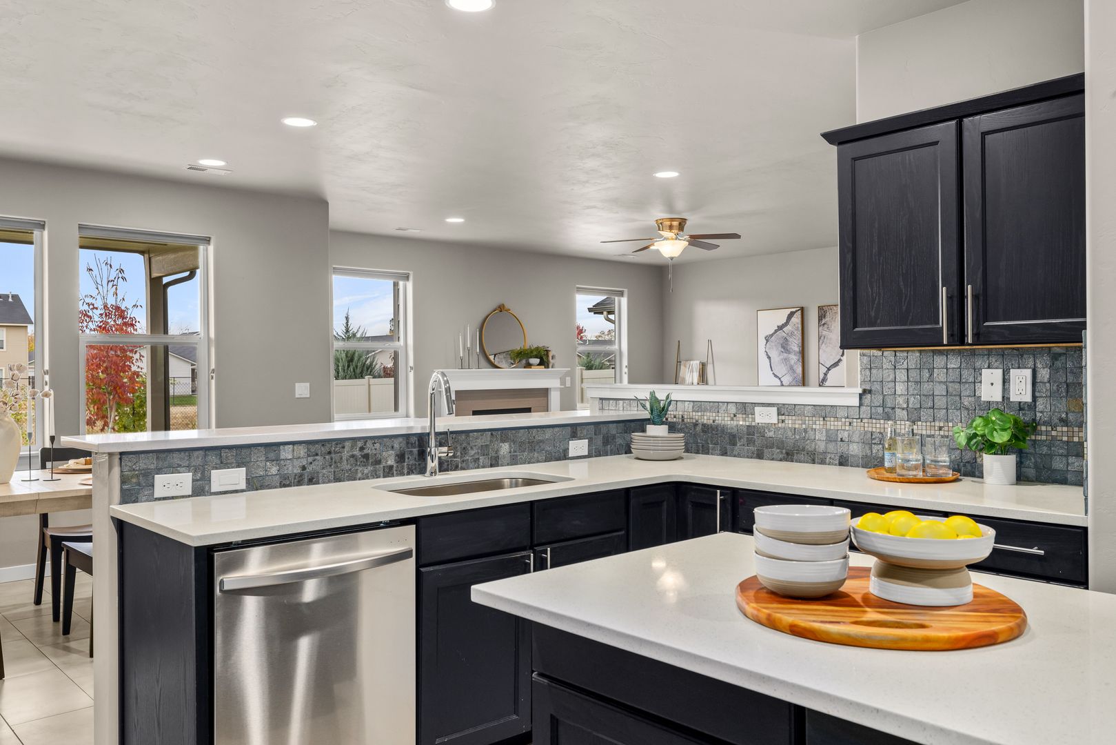 The open-concept great room is anchored by a cozy fireplace and framed by large windows that invite in natural light. An atrium door connects seamlessly to the backyard, extending your living space outdoors. The kitchen is both functional and refined, featuring quartz countertops, a central prep island, breakfast bar seating, tile backsplash, and a full suite of stainless steel appliances, including a French-door refrigerator.