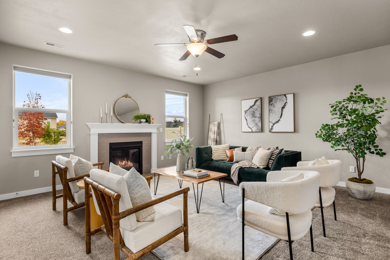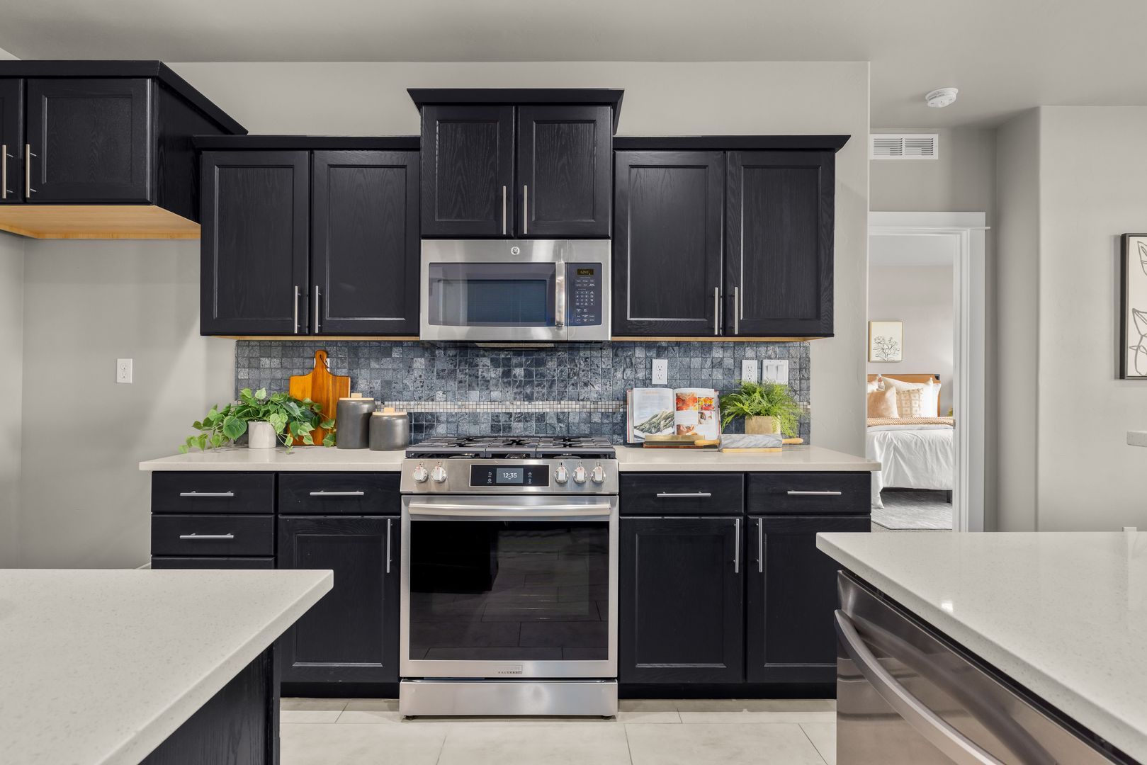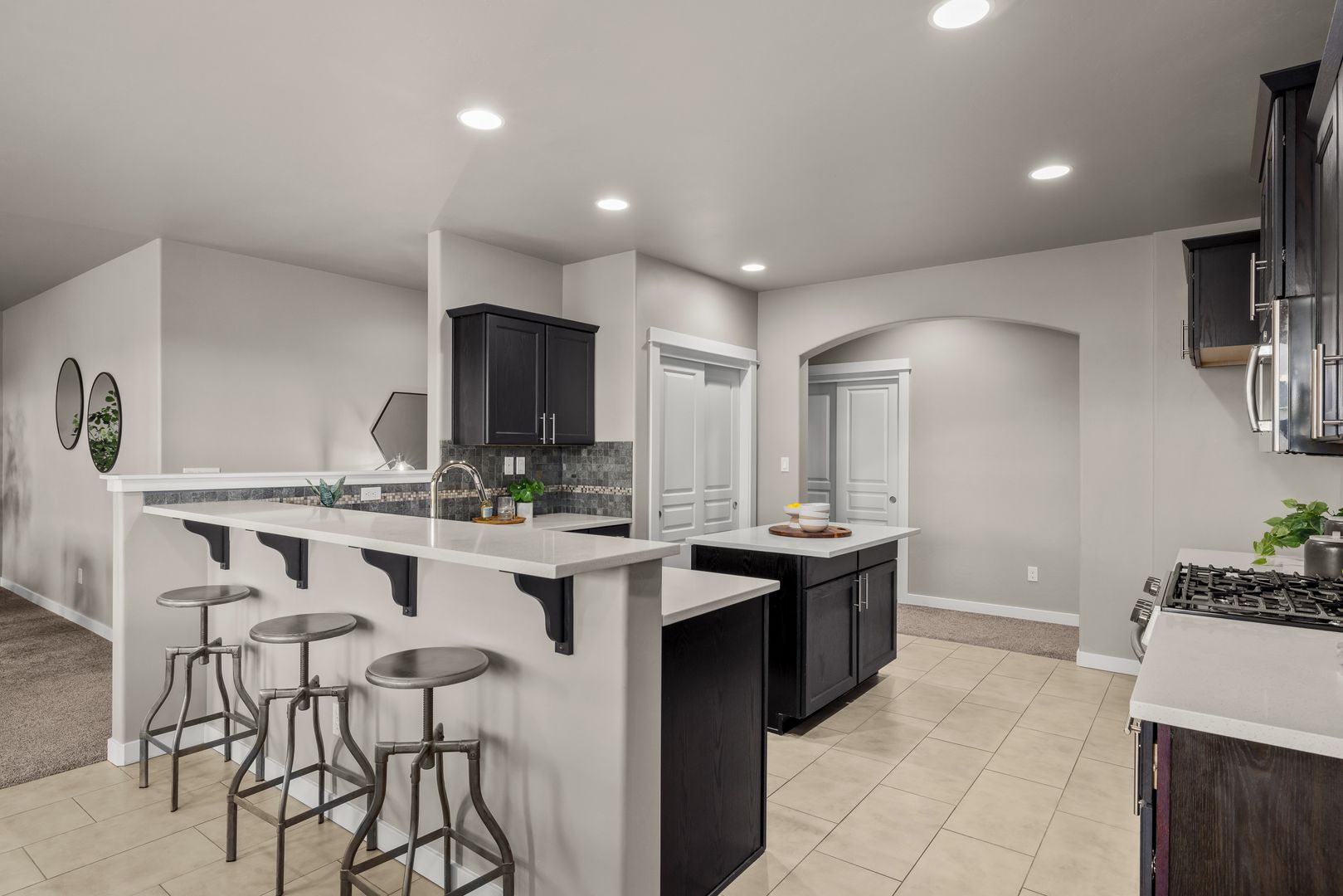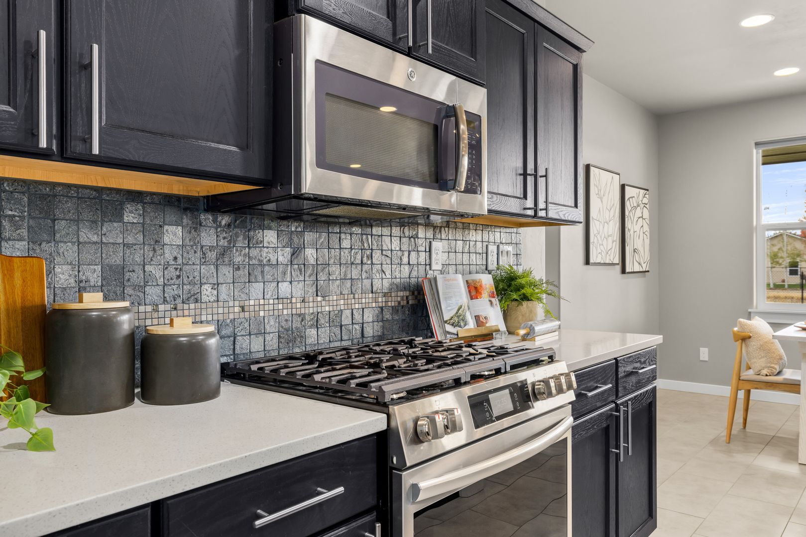 The open-concept great room is anchored by a cozy fireplace and framed by large windows that invite in natural light. An atrium door connects seamlessly to the backyard, extending your living space outdoors. The kitchen is both functional and refined, featuring quartz countertops, a central prep island, breakfast bar seating, tile backsplash, and a full suite of stainless steel appliances, including a French-door refrigerator.