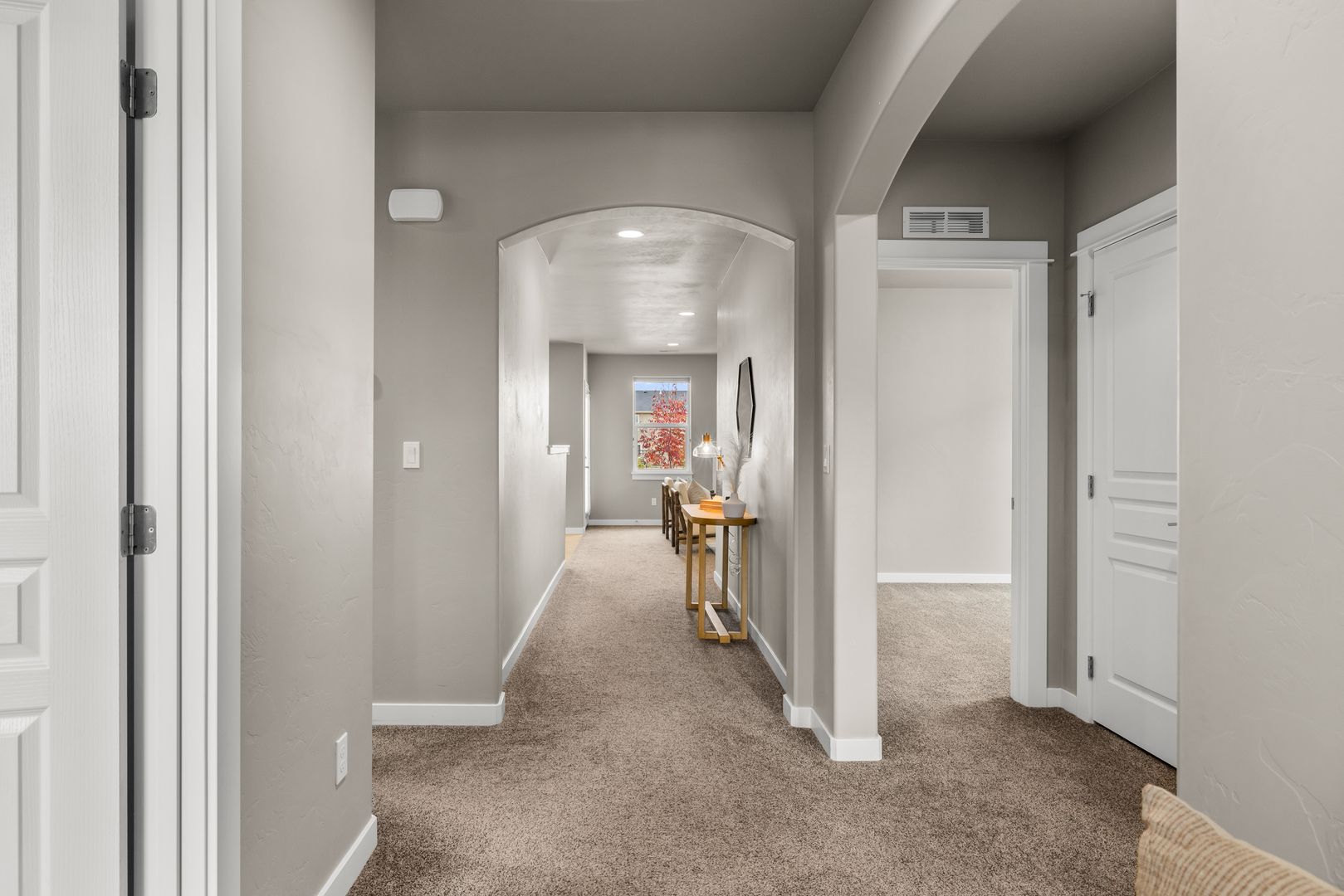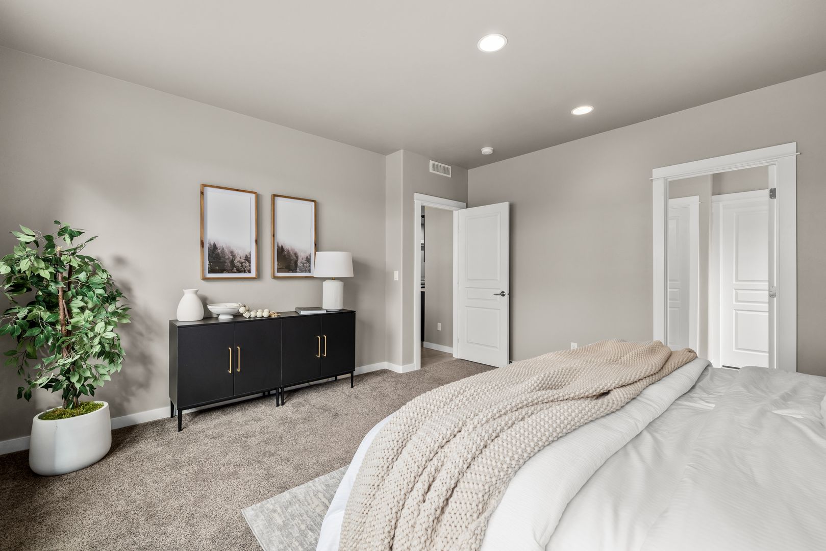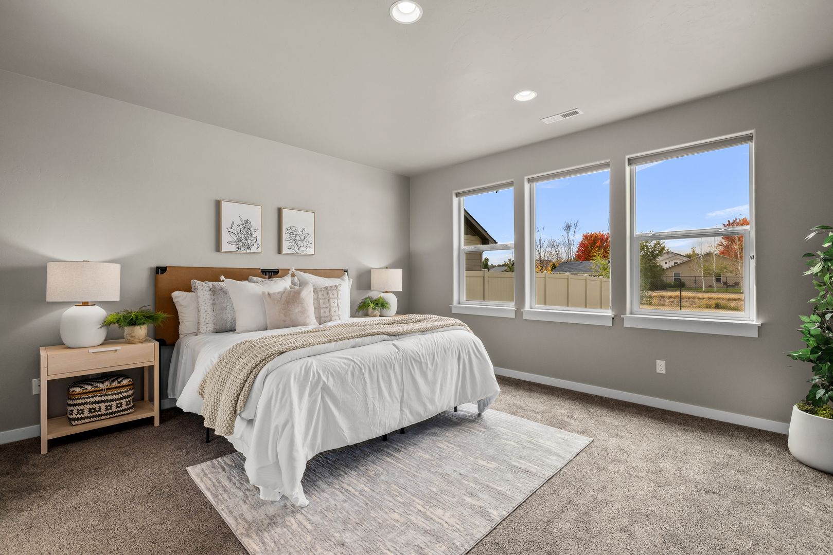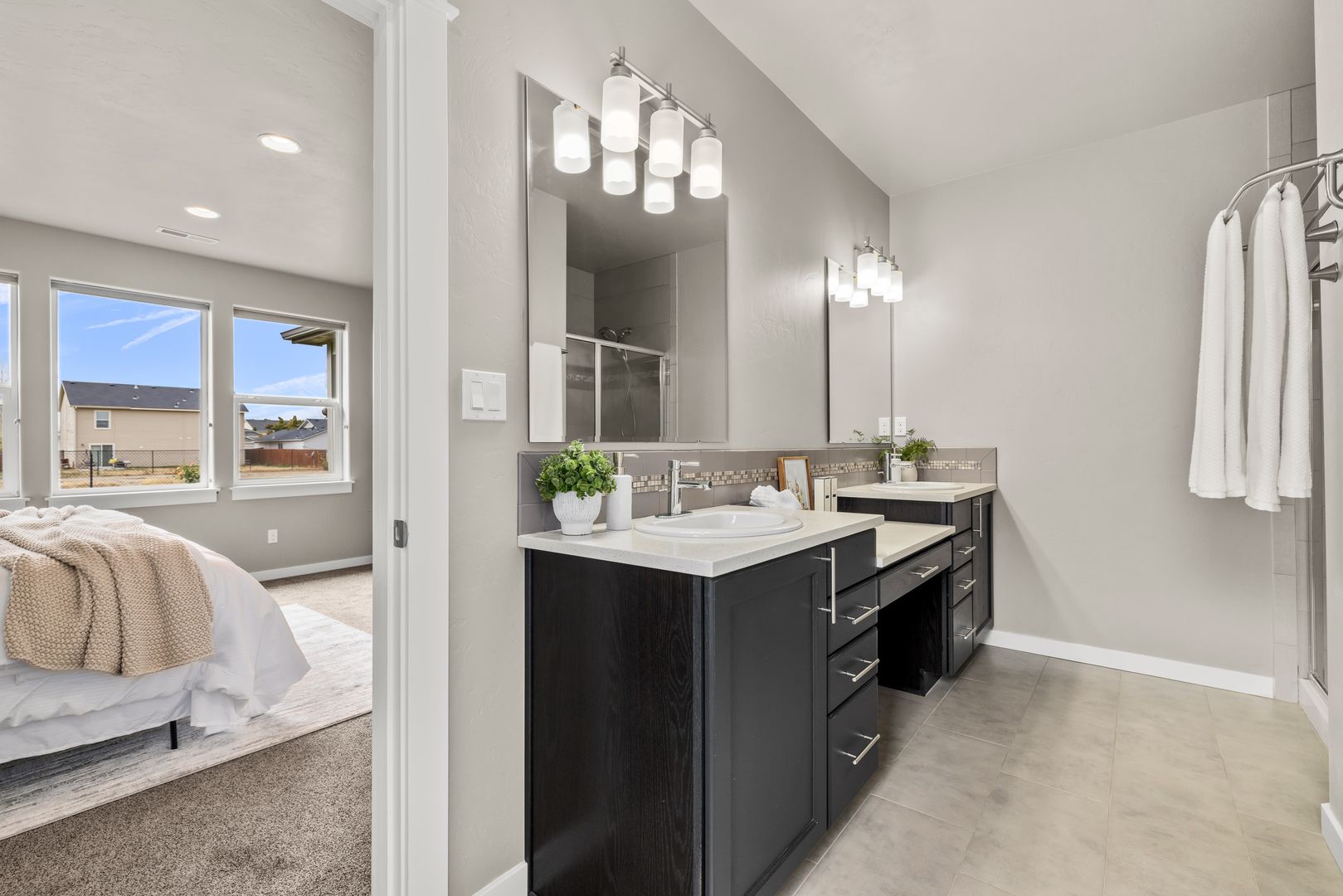 A split-bedroom design provides separation and flexibility. The primary suite is tucked privately at the rear of the home, while three additional bedrooms and a dual vanity bath are positioned near the front. The fourth bedroom offers adaptability as a home office, den, or guest space, supporting a variety of lifestyles.