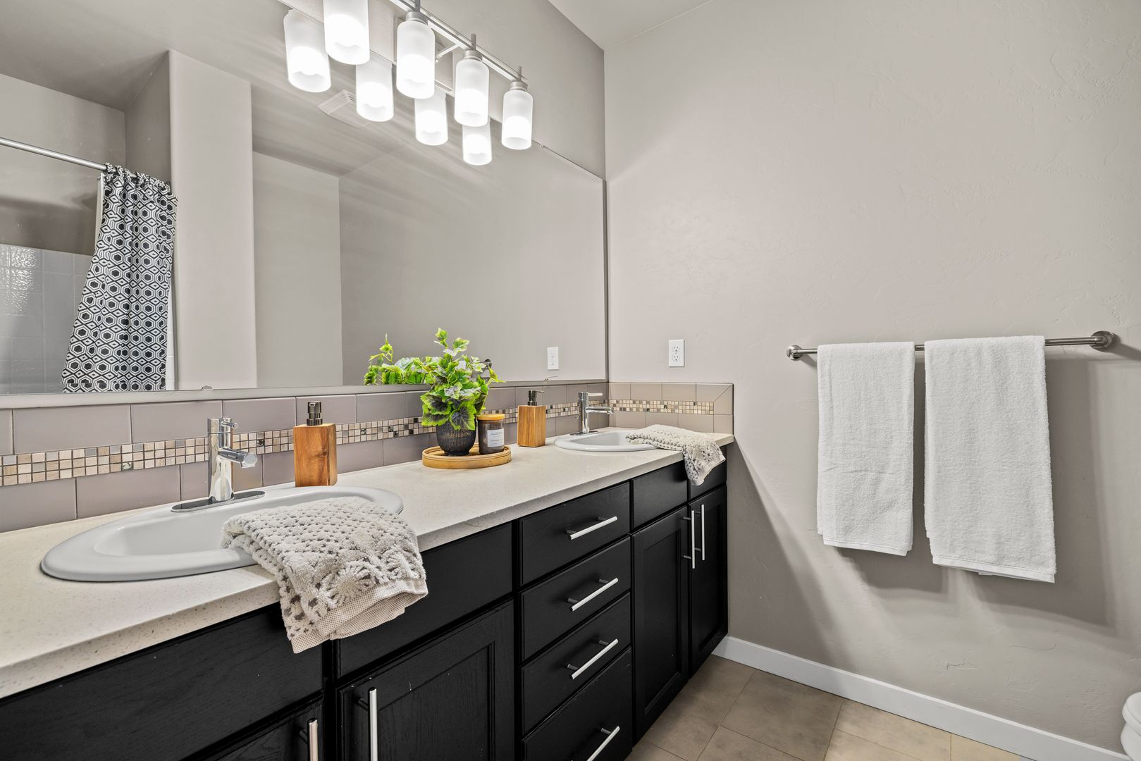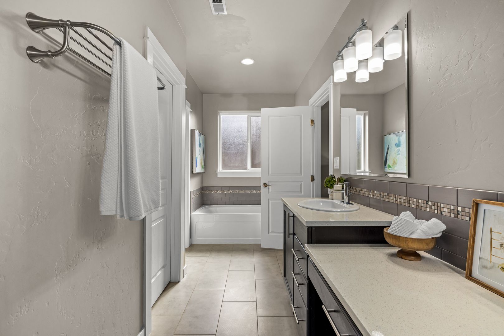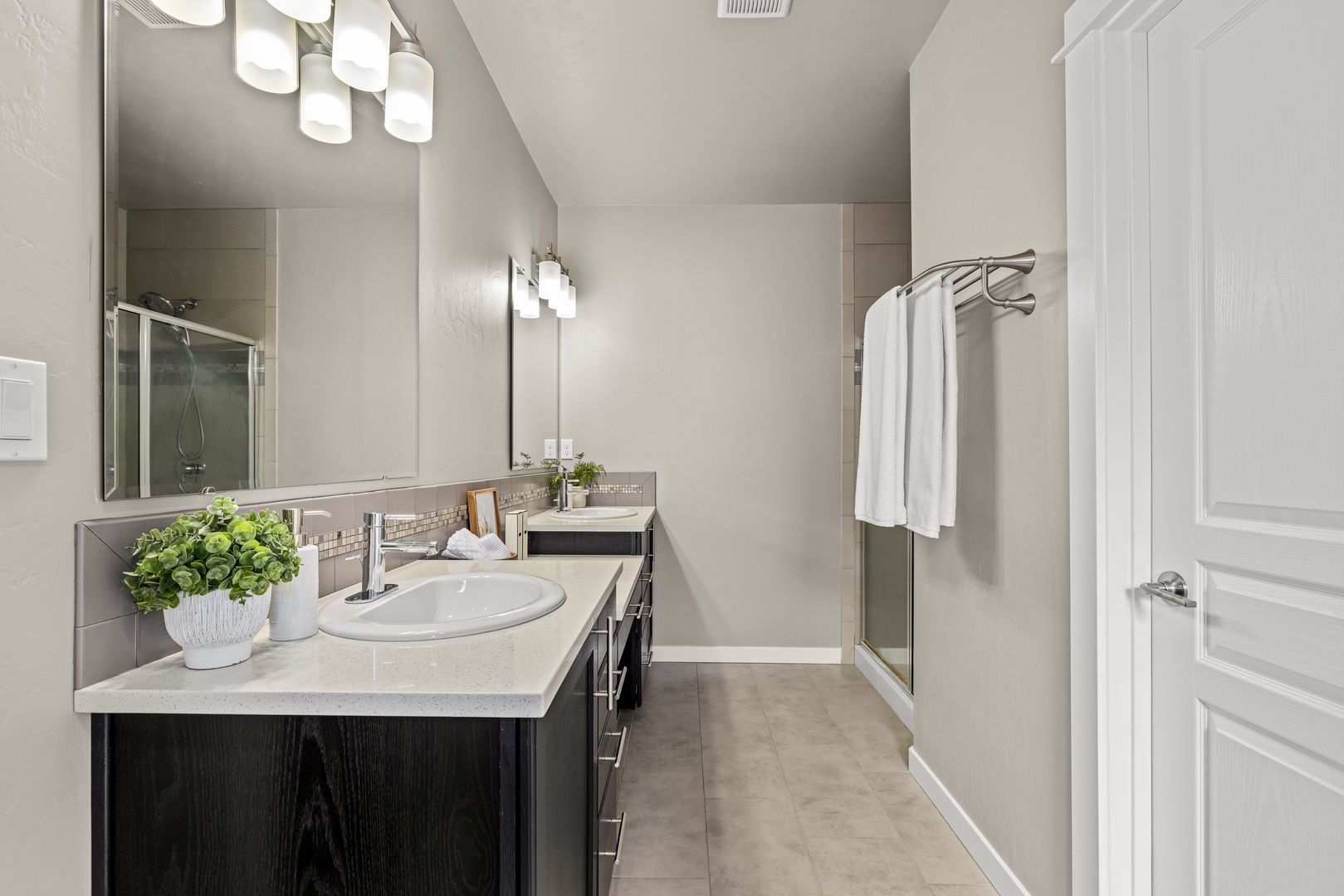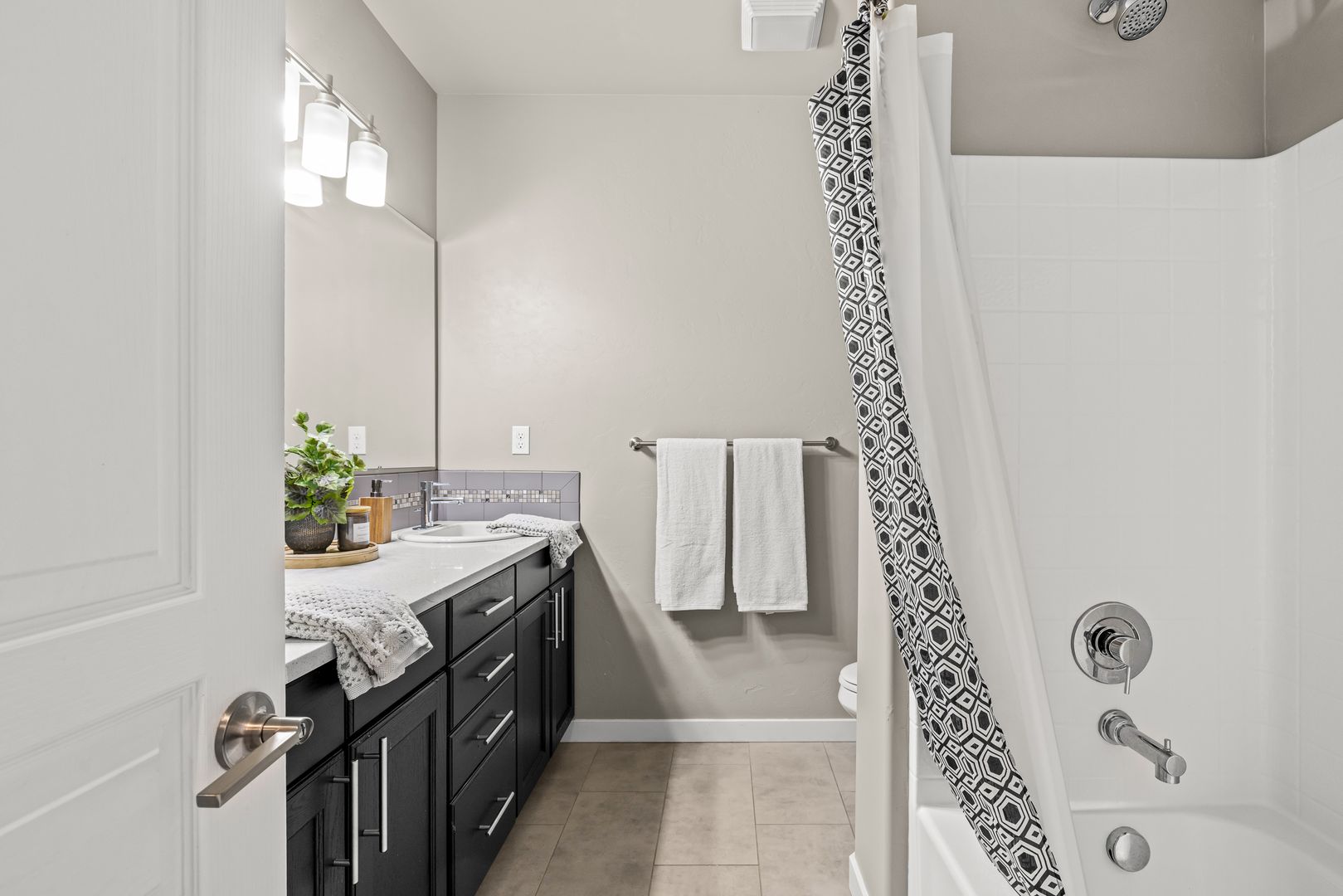 A split-bedroom design provides separation and flexibility. The primary suite is tucked privately at the rear of the home, while three additional bedrooms and a dual vanity bath are positioned near the front. The fourth bedroom offers adaptability as a home office, den, or guest space, supporting a variety of lifestyles.
