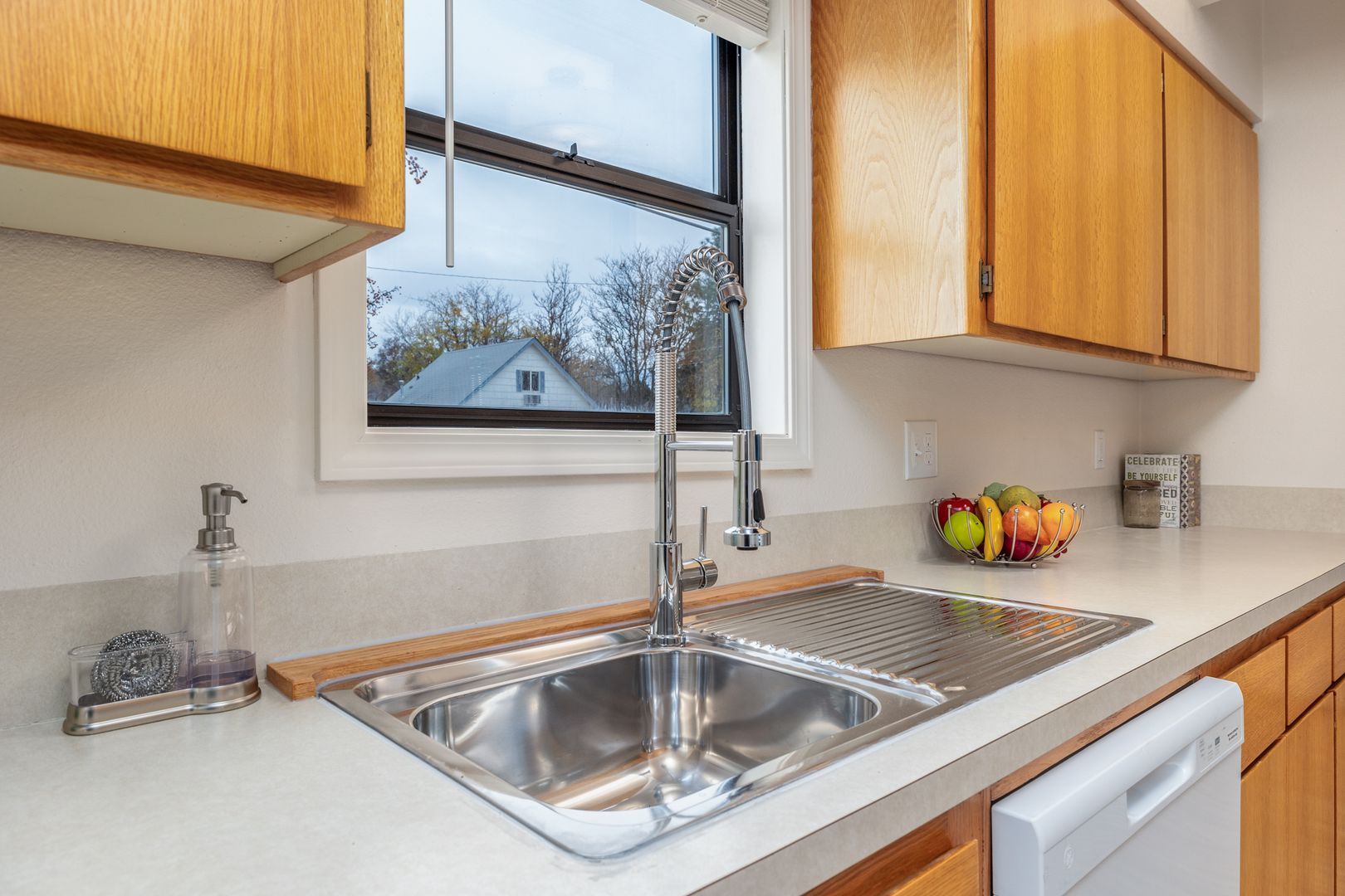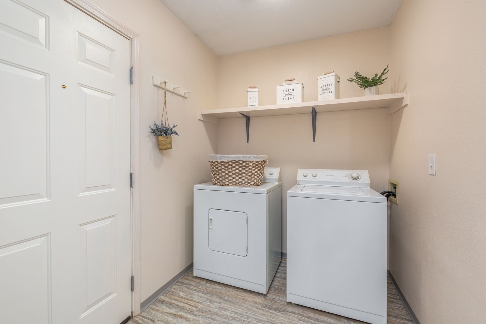 FUNCTIONAL STYLE & INTERIOR UPGRADES include fresh interior and exterior paint, new high-efficiency windows, and upgraded fixtures. Easy care LVP flooring runs through the living areas and hallway, while fresh carpet adds warmth to both bedrooms. A galley kitchen with new appliances adjoins a separate laundry room with washer and dryer for added convenience.