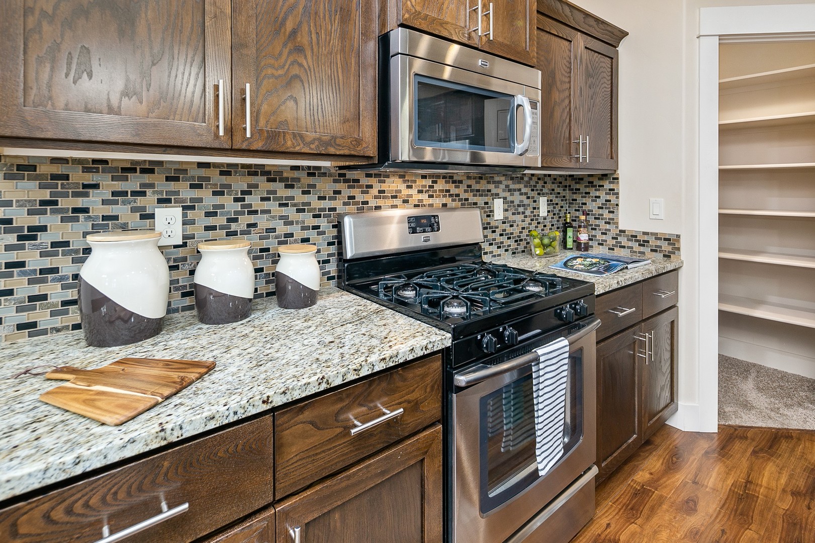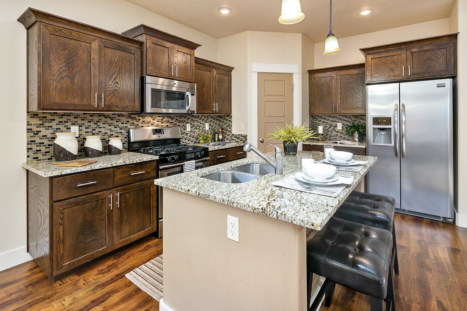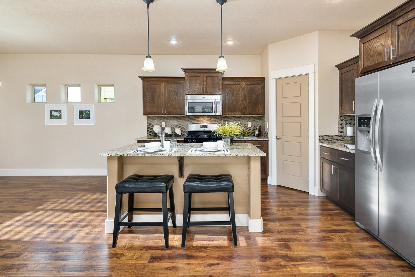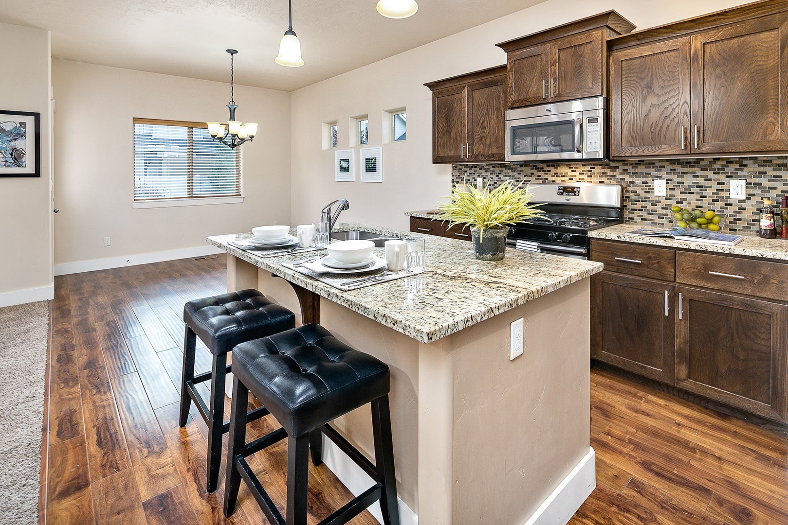 At the center of the home, a spacious great room opens to a bright kitchen and dining nook, creating a comfortable and connected living space. The kitchen features stainless steel appliances, a walk-in pantry, and an oversized granite island perfect for gathering or meal prep. An adjoining dining area offers direct access to a covered back patio for seamless indoor-outdoor enjoyment.