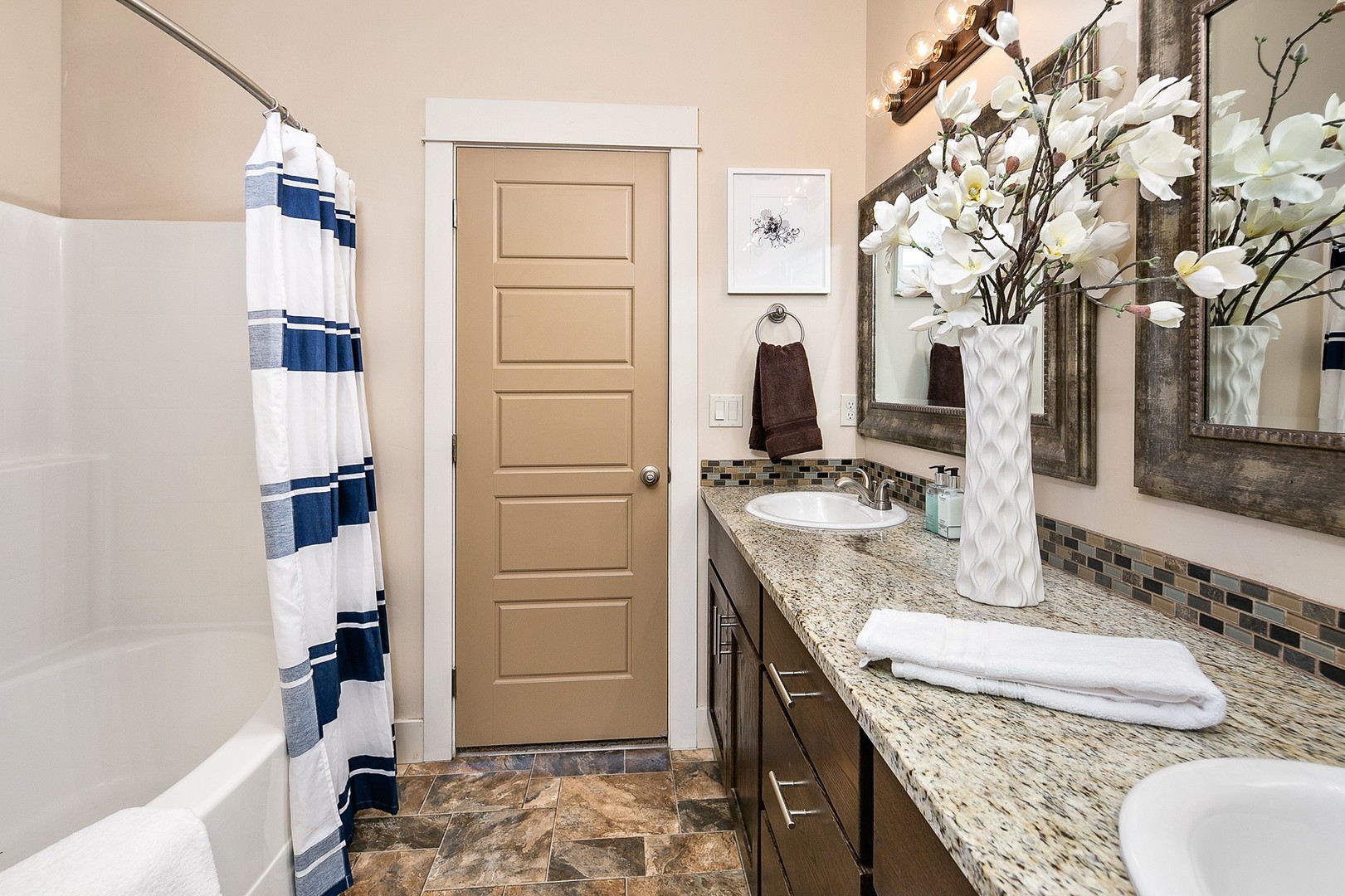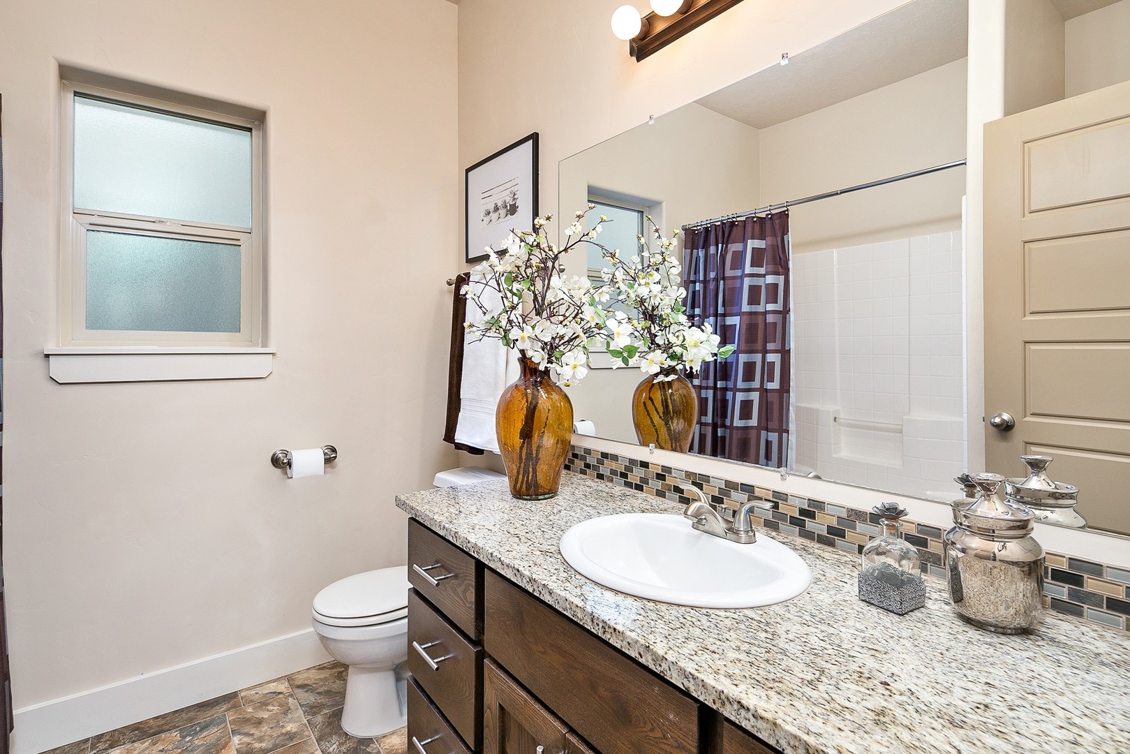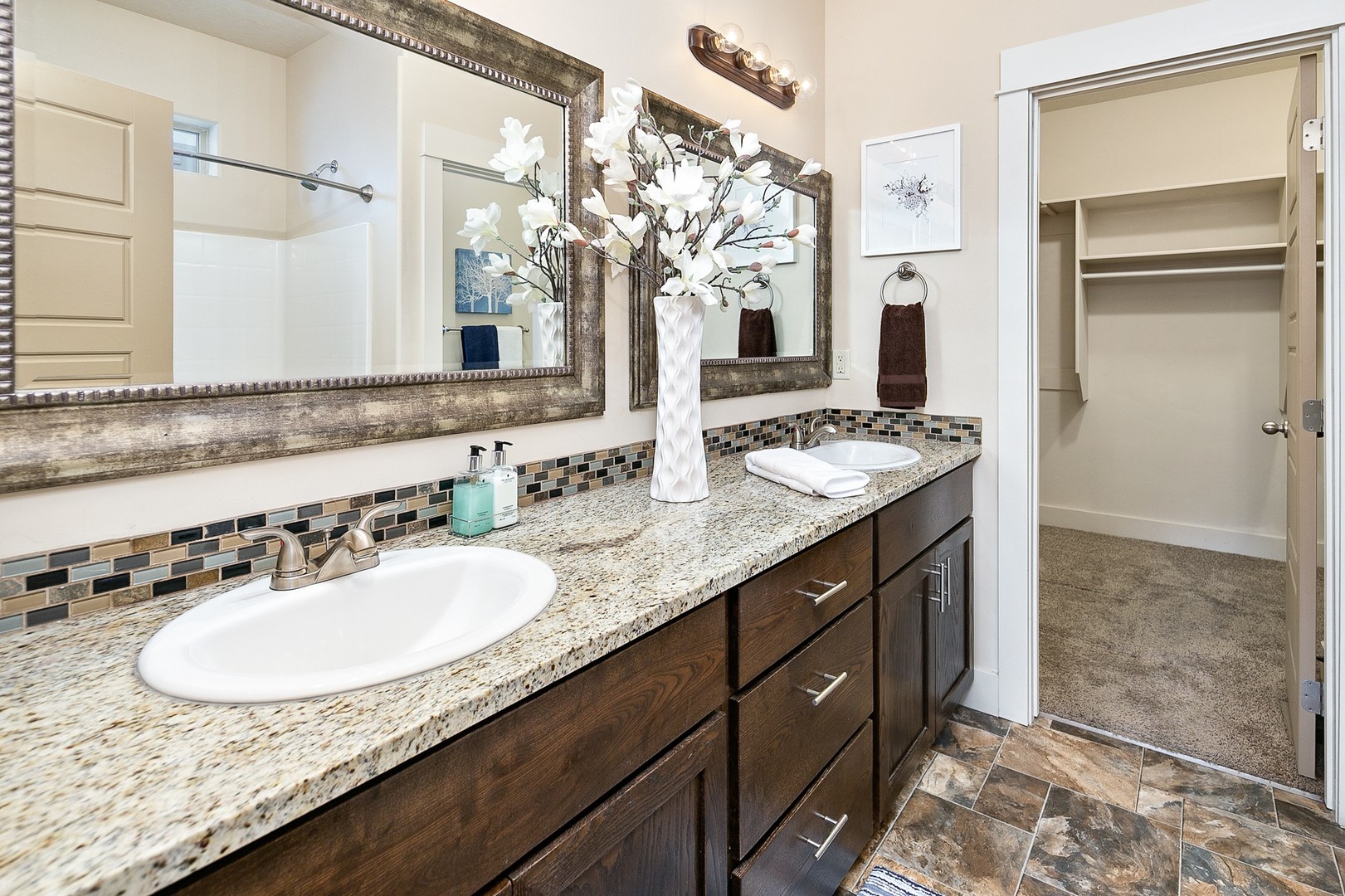 The split-bedroom layout provides privacy and flexibility, with the primary suite tucked away at the rear of the home. The en-suite bathroom includes a granite dual vanity, walk-in shower, separate soaker tub, and a generous walk-in closet.