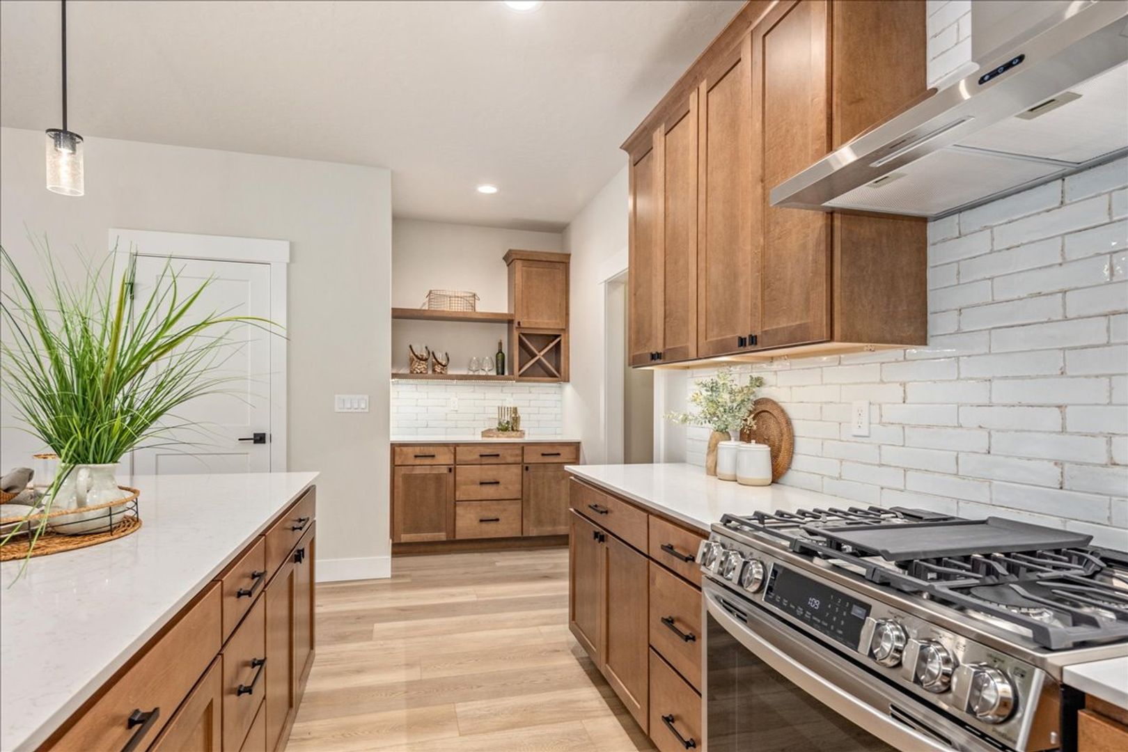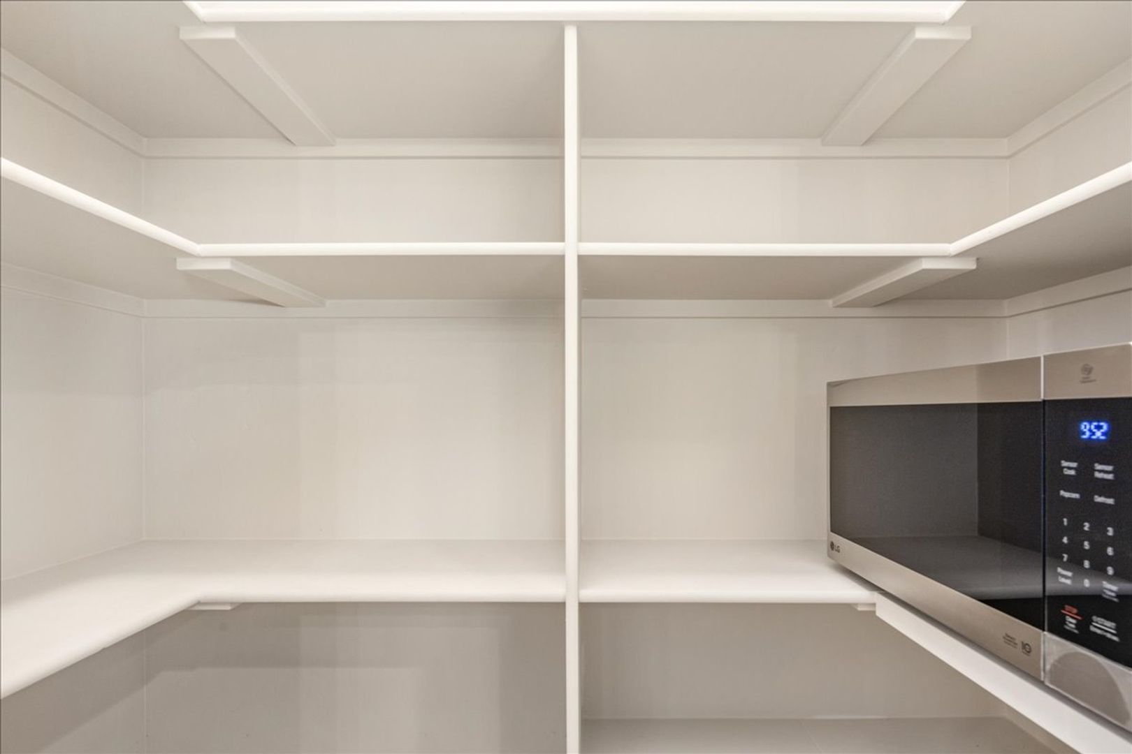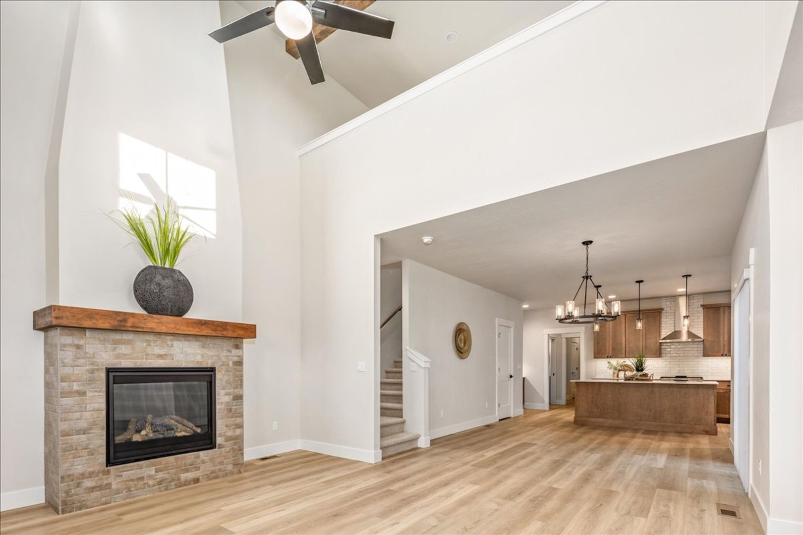Step into a dramatic living room with soaring 18-foot ceilings, exposed accent beams, and a beautifully detailed fireplace with a custom-wrapped mantel. Expansive windows draw in abundant natural light, enhancing the open-concept layout that connects living, dining, and kitchen spaces seamlessly. The chef’s kitchen is designed to impress, featuring custom dovetail soft-close cabinetry, a generous quartz island, stainless steel appliances including an air fry oven, a beverage bar, and a spacious walk-in pantry.