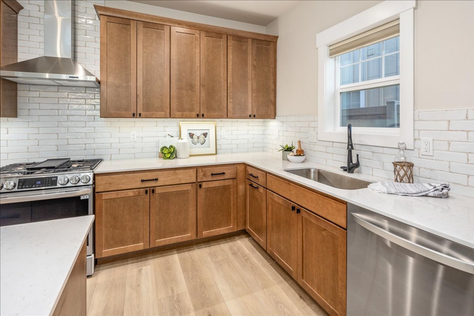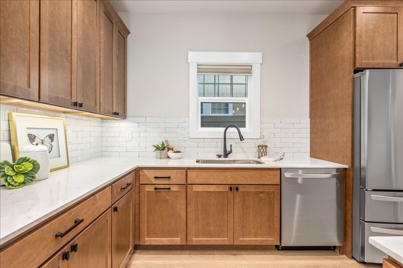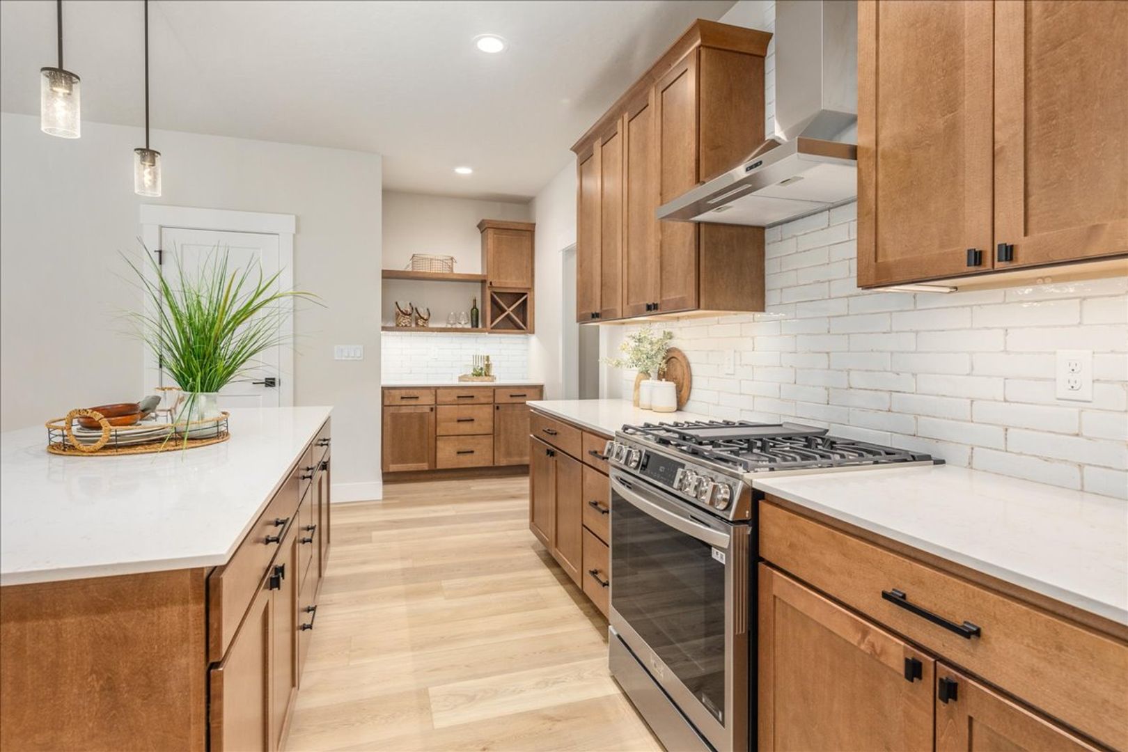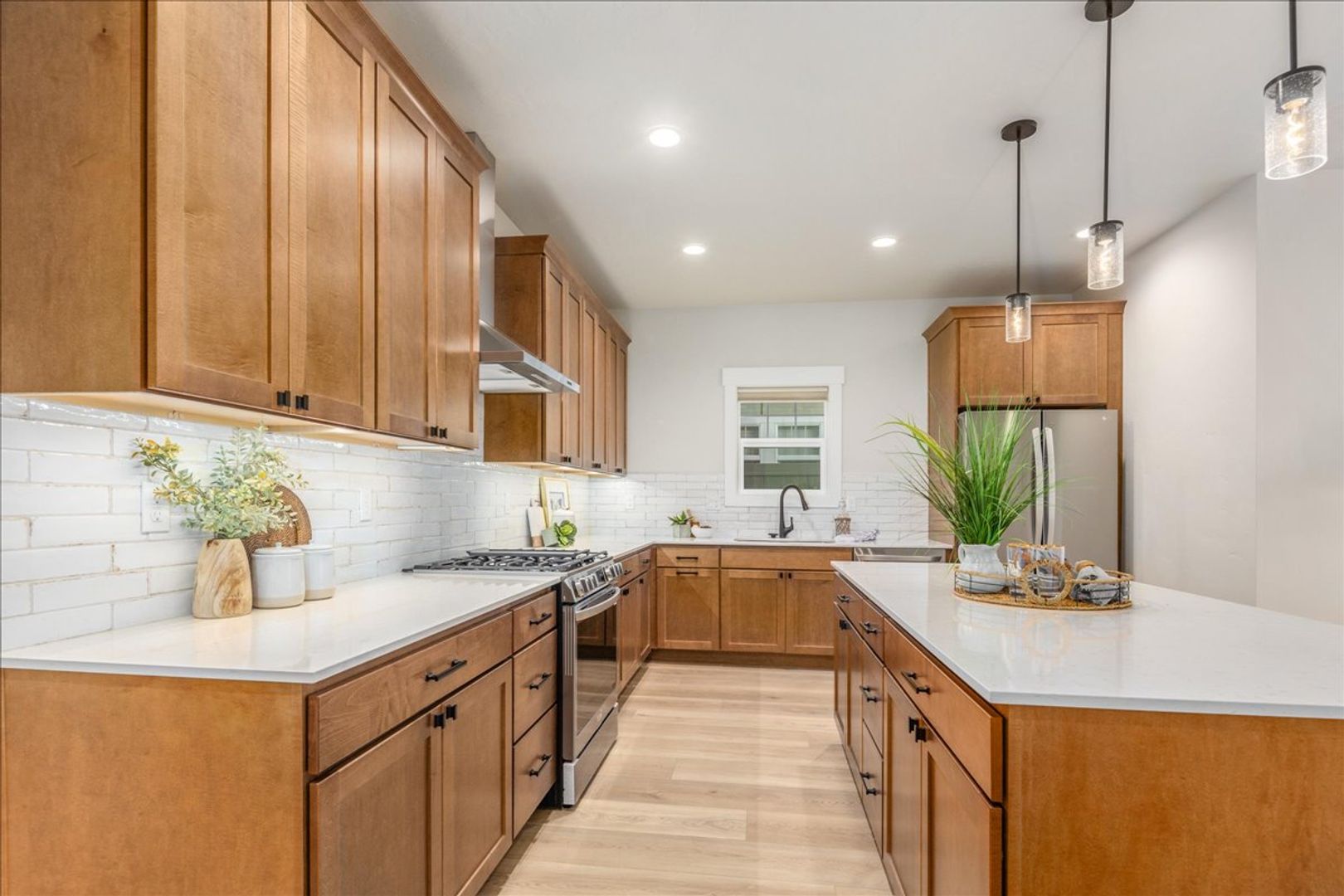 Step into a dramatic living room with soaring 18-foot ceilings, exposed accent beams, and a beautifully detailed fireplace with a custom-wrapped mantel. Expansive windows draw in abundant natural light, enhancing the open-concept layout that connects living, dining, and kitchen spaces seamlessly. The chef’s kitchen is designed to impress, featuring custom dovetail soft-close cabinetry, a generous quartz island, stainless steel appliances including an air fry oven, a beverage bar, and a spacious walk-in pantry.