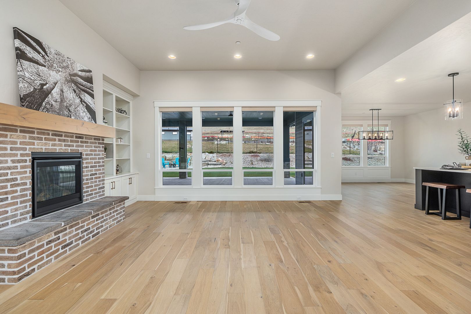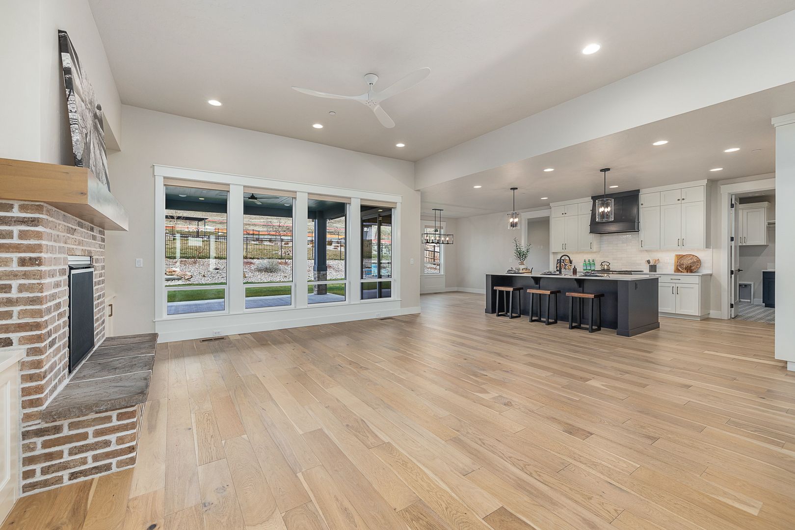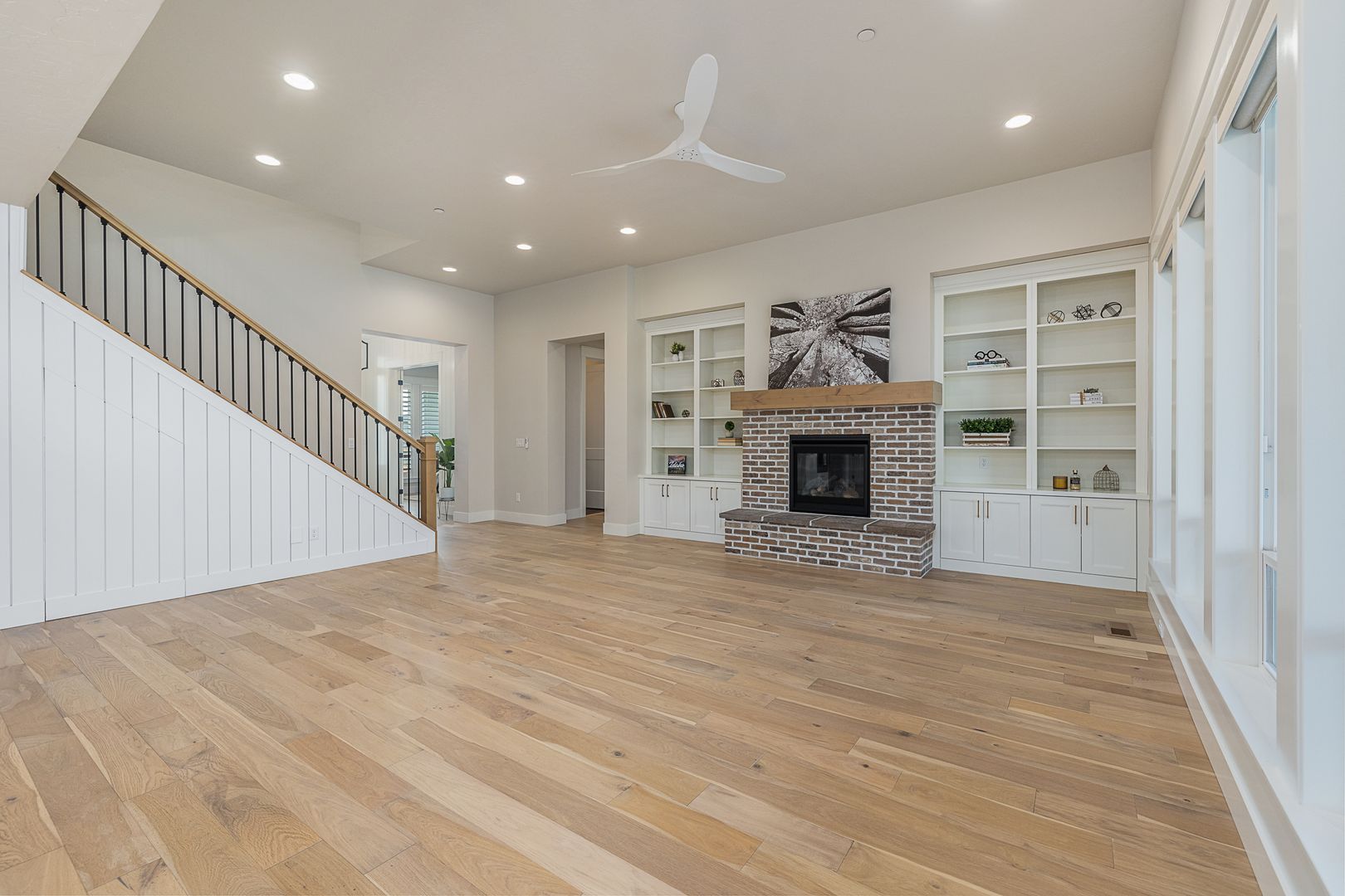 EXECUTIVE GREAT ROOM & CHEF'S KITCHEN: The expansive Great Room is the heart of the home, defined by soaring ceilings, a statement-making brick fireplace flanked by custom built-ins, and a dramatic wall of windows that bathe the space in natural light. A seamless flow connects the living area to a spacious dining nook and the oversized, covered patio, ideal for sophisticated entertaining. The Gourmet Chef's Kitchen features a stunning central island, top-tier Wolf and Sub-Zero appliances, luminous quartz countertops, and bespoke custom cabinetry. A generous Butler’s Pantry ensures effortless hosting and superior organization.