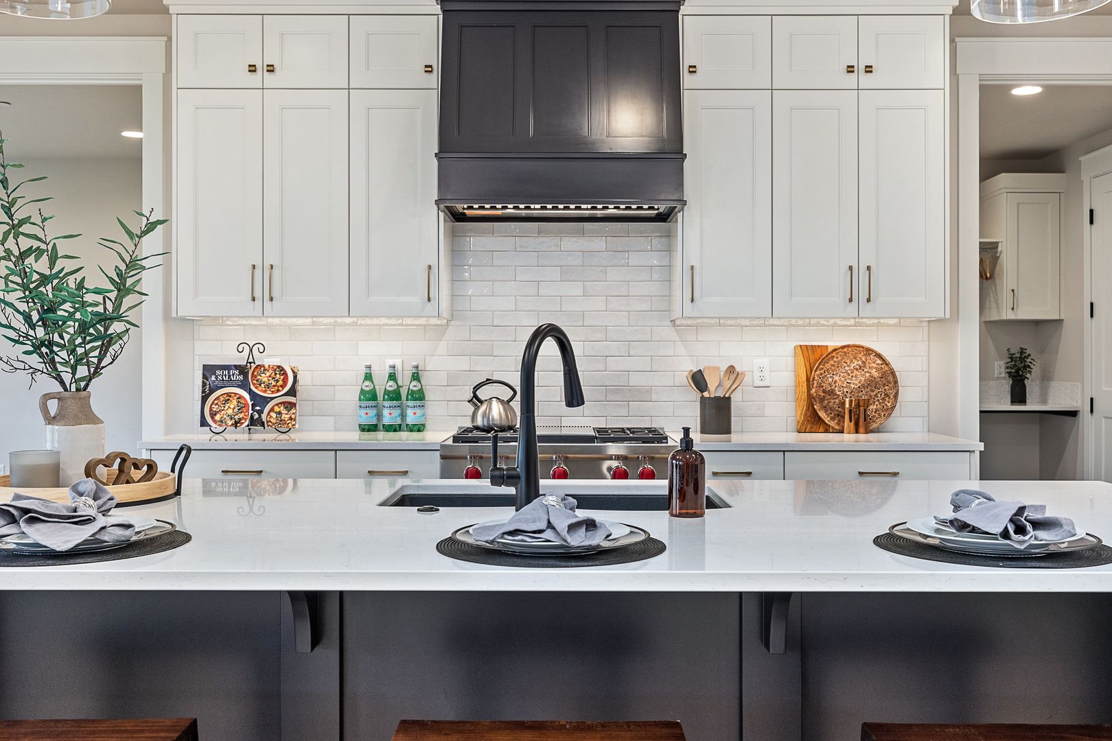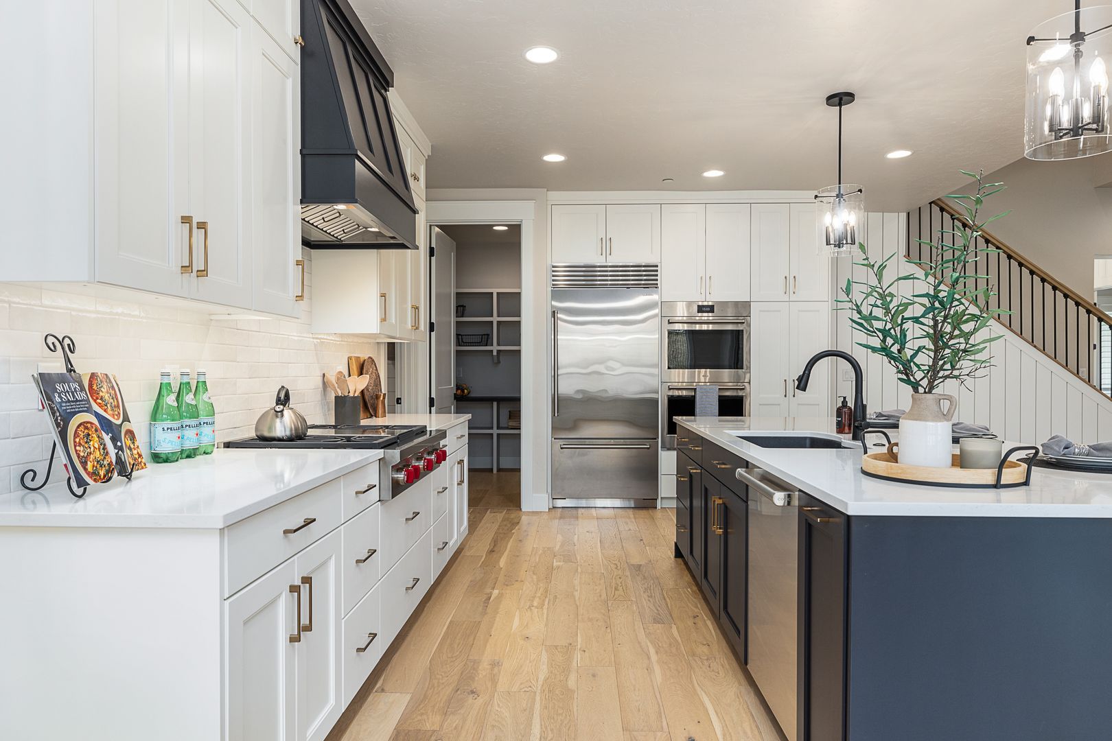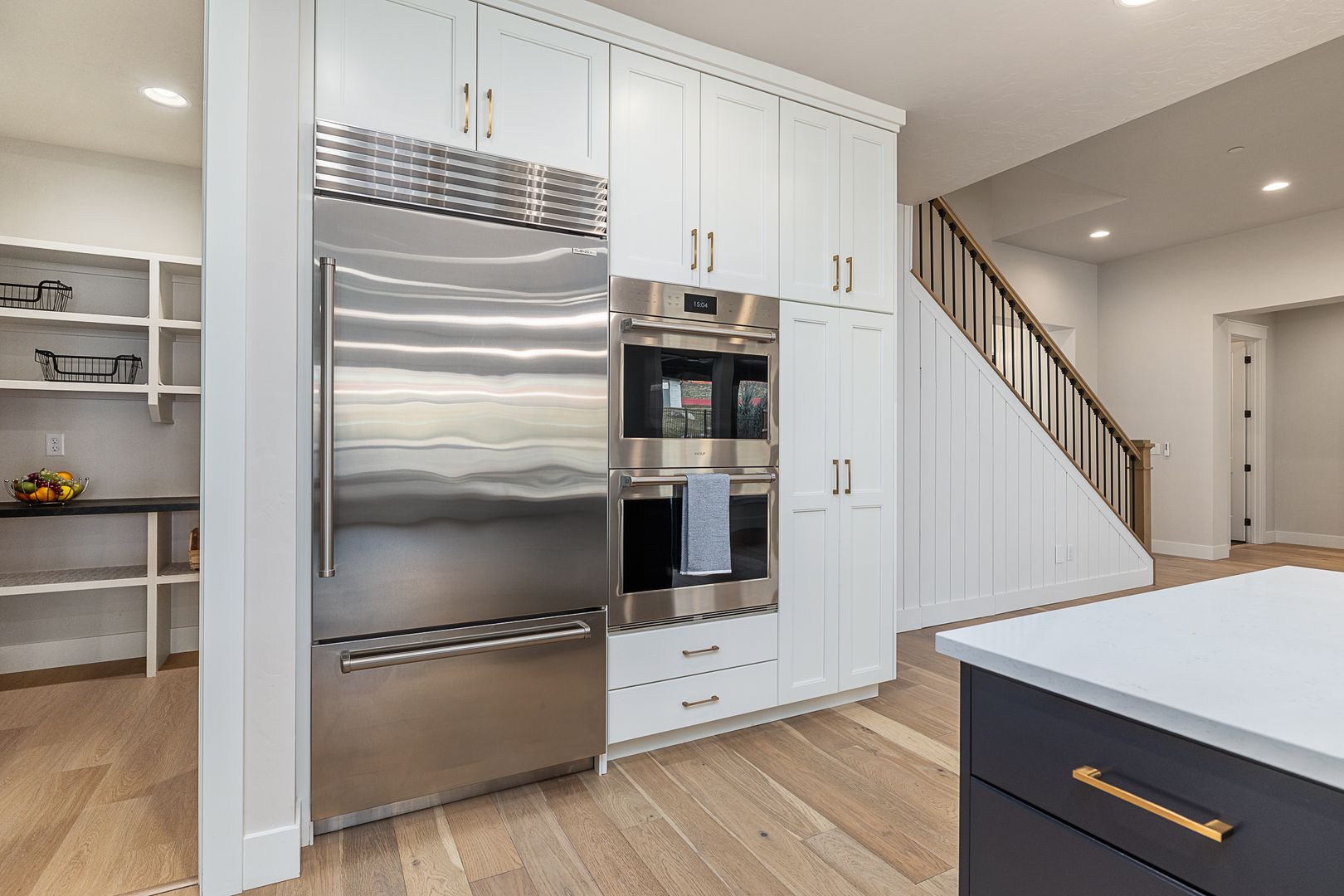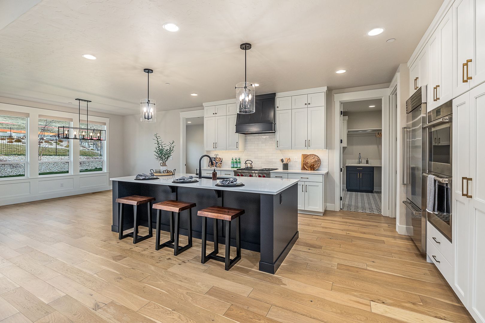 EXECUTIVE GREAT ROOM & CHEF'S KITCHEN: The expansive Great Room is the heart of the home, defined by soaring ceilings, a statement-making brick fireplace flanked by custom built-ins, and a dramatic wall of windows that bathe the space in natural light. A seamless flow connects the living area to a spacious dining nook and the oversized, covered patio, ideal for sophisticated entertaining. The Gourmet Chef's Kitchen features a stunning central island, top-tier Wolf and Sub-Zero appliances, luminous quartz countertops, and bespoke custom cabinetry. A generous Butler’s Pantry ensures effortless hosting and superior organization.