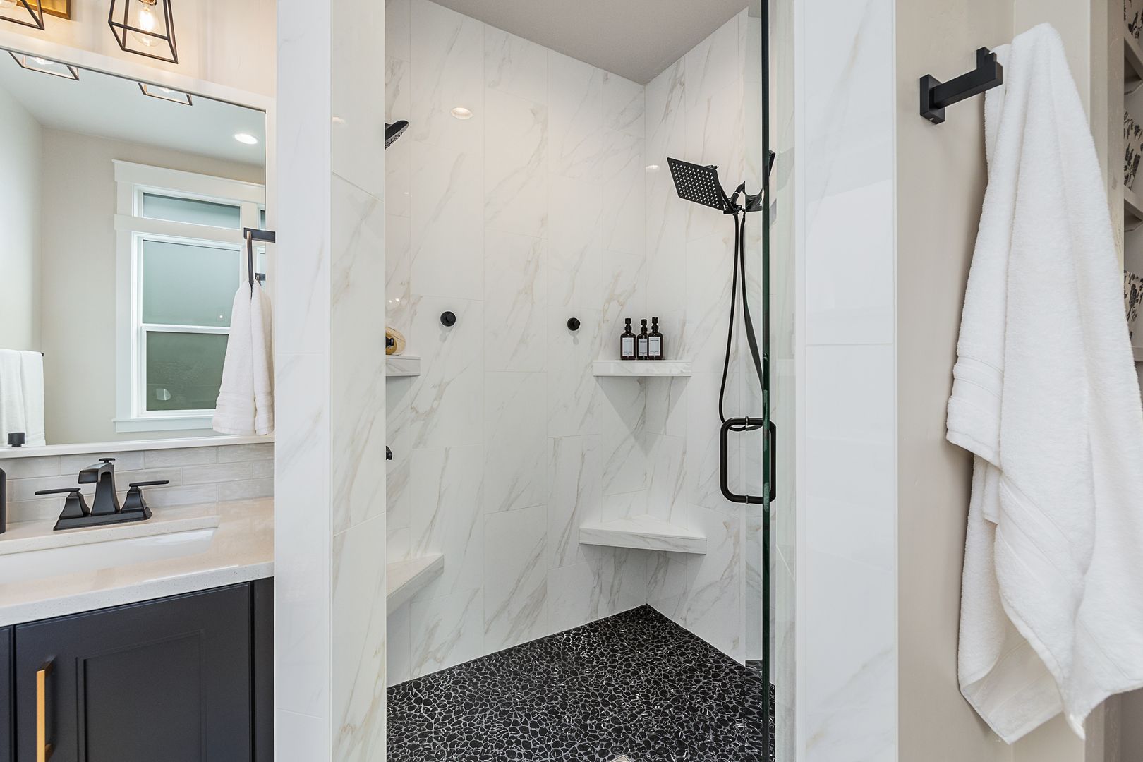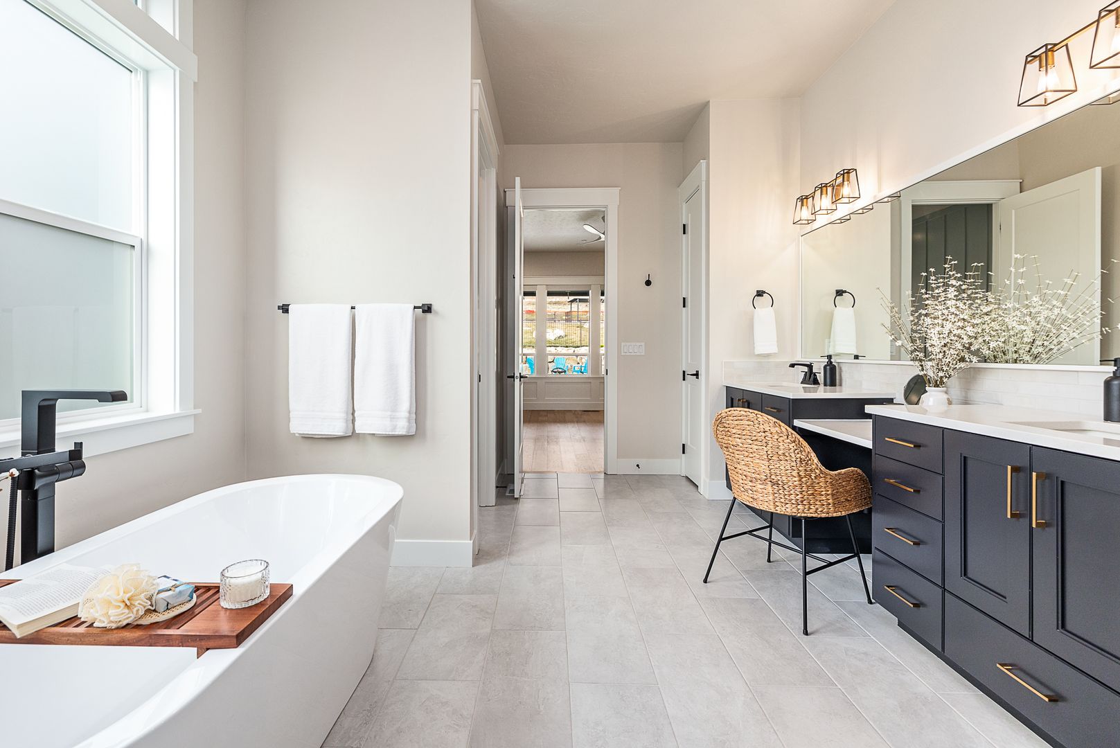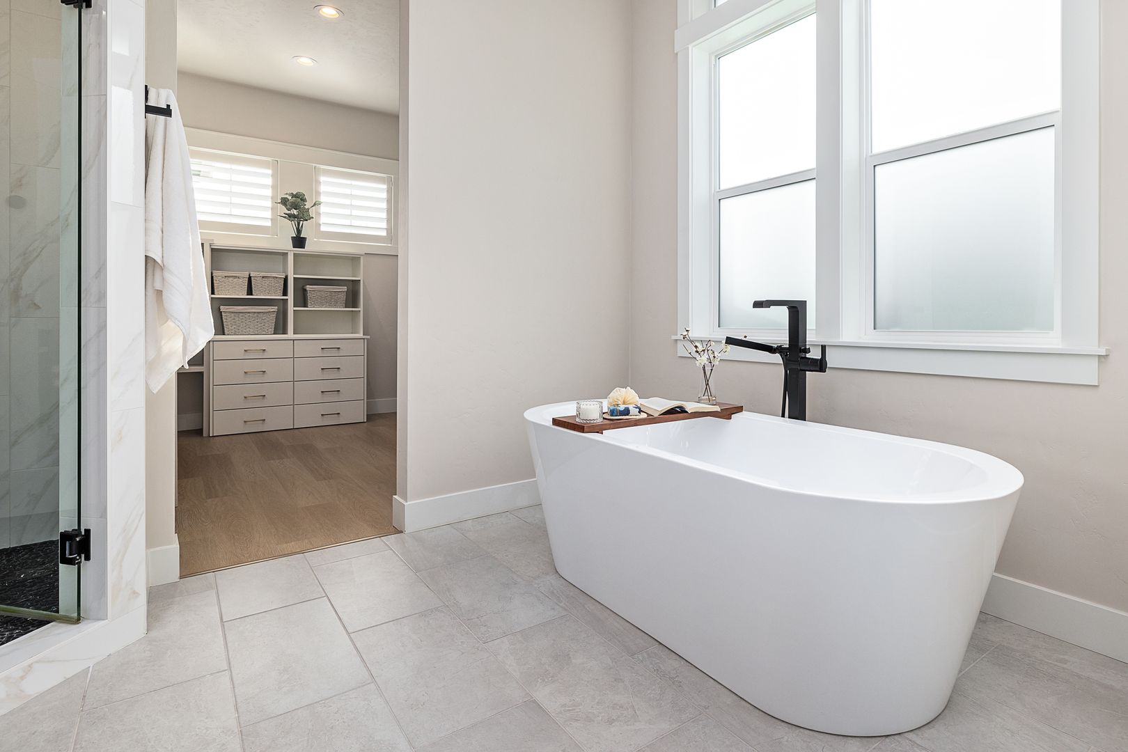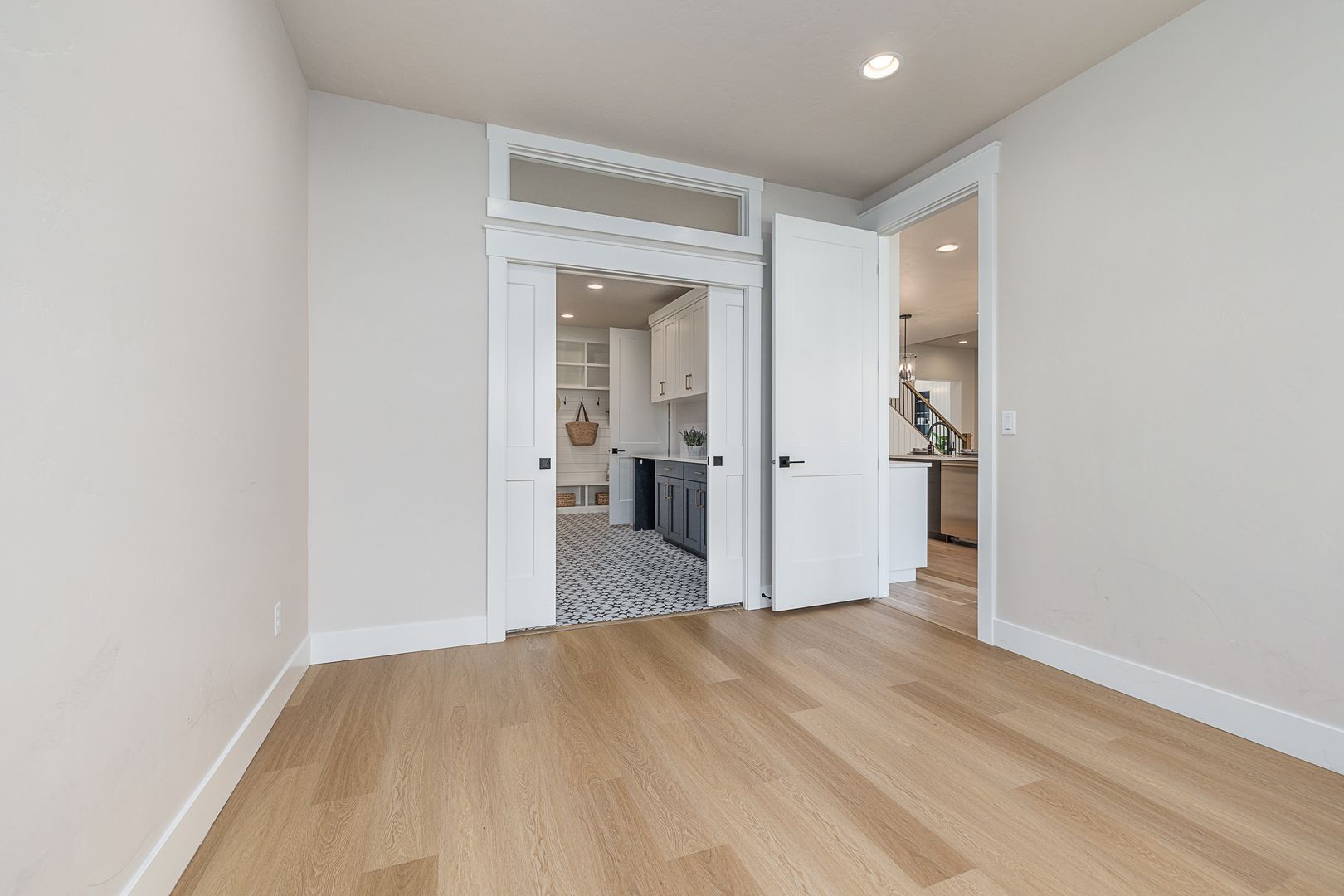 PRIVATE MAIN-LEVEL SUITE & DEDICATED WORKSPACE: The main-level hosts a truly private Primary Retreat. This elegant sanctuary features a designer accent wall and direct access to the outdoor patio. The spa-inspired Ensuite Bath boasts dual custom vanities, a dedicated make-up station, a luxurious freestanding soaking tub, a tiled walk-in shower, and a substantial custom-outfitted closet. For the modern executive, the main floor also offers a dedicated Home Office with rich built-in shelving, complemented by a versatile secondary den or craft room, providing unparalleled flexibility for work and leisure.